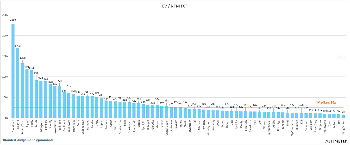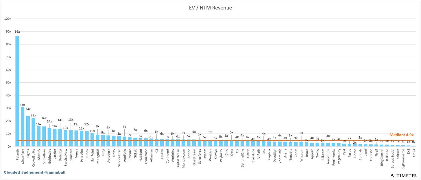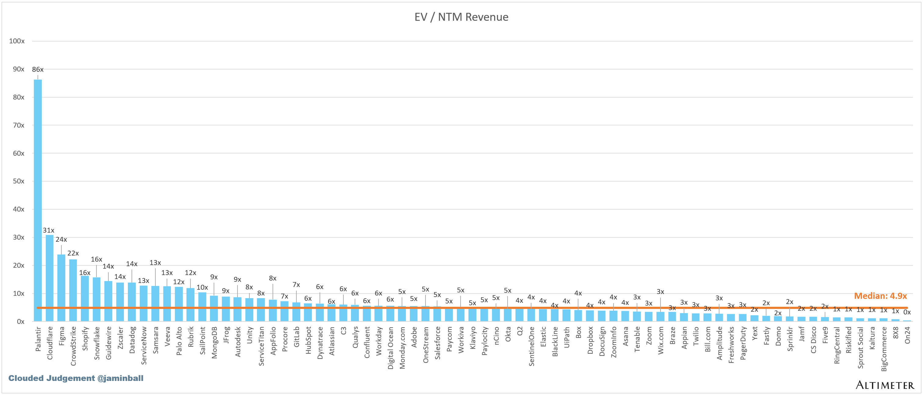 SaaS businesses are generally valued on a multiple of their revenue - in most cases the projected revenue for the next 12 months. Revenue multiples are a shorthand valuation framework. Given most software companies are not profitable, or not generating meaningful FCF, it’s the only metric to compare the entire industry against. Even a DCF is riddled with long term assumptions. The promise of SaaS is that growth in the early years leads to profits in the mature years. Multiples shown below are calculated by taking the Enterprise Value (market cap + debt - cash) / NTM revenue.