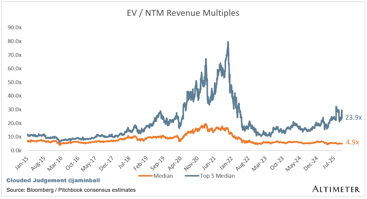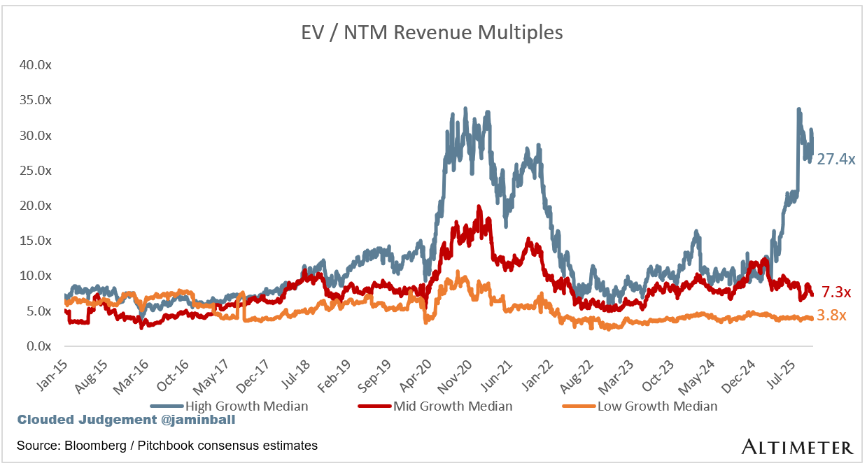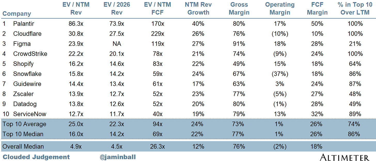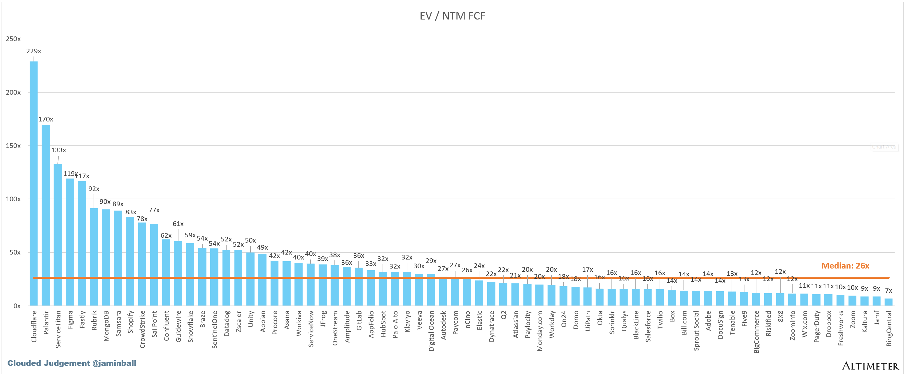 SaaS businesses are generally valued on a multiple of their revenue - in most cases the projected revenue for the next 12 months. Revenue multiples are a shorthand valuation framework. Given most software companies are not profitable, or not generating meaningful FCF, it’s the only metric to compare the entire industry against. Even a DCF is riddled with long term assumptions. The promise of SaaS is that growth in the early years leads to profits in the mature years. Multiples shown below are calculated by taking the Enterprise Value (market cap + debt - cash) / NTM revenue.
