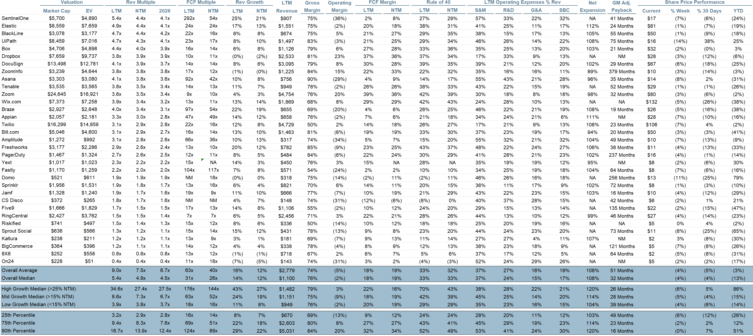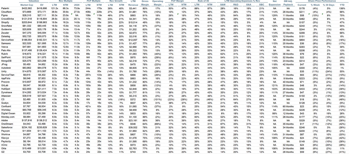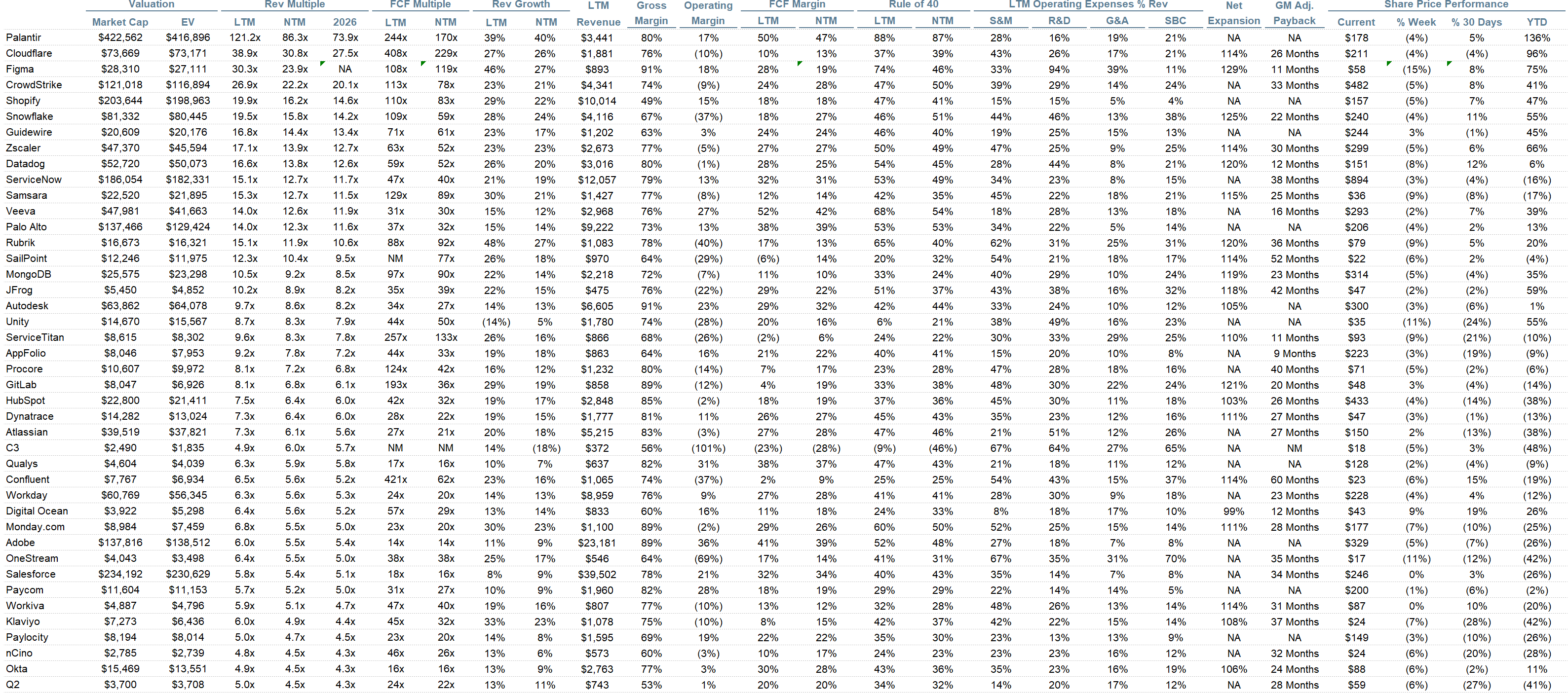 Rule of 40 shows rev growth + FCF margin (both LTM and NTM for growth + margins). FCF calculated as Cash Flow from Operations - Capital Expenditures
