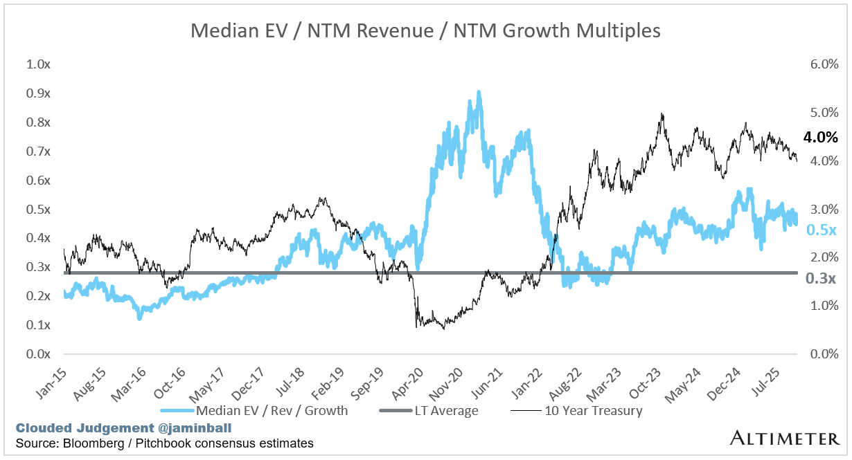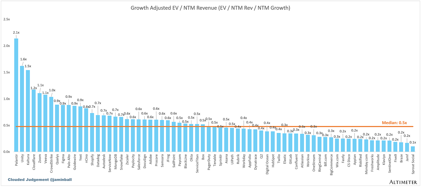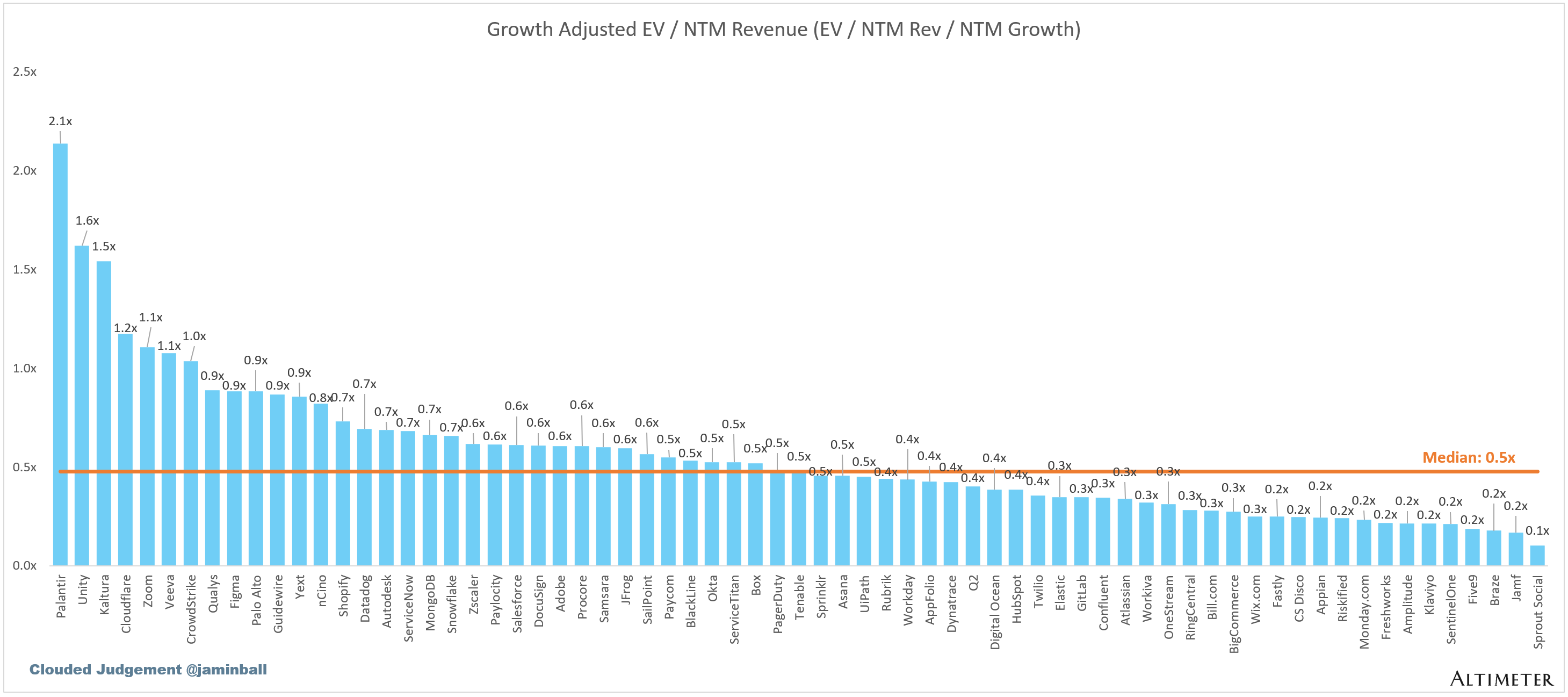The below chart shows the EV / NTM revenue multiple divided by NTM consensus growth expectations. So a company trading at 20x NTM revenue that is projected to grow 100% would be trading at 0.2x. The goal of this graph is to show how relatively cheap / expensive each stock is relative to its growth expectations.