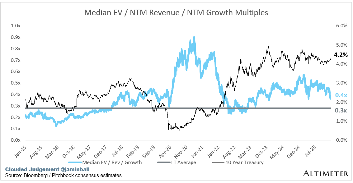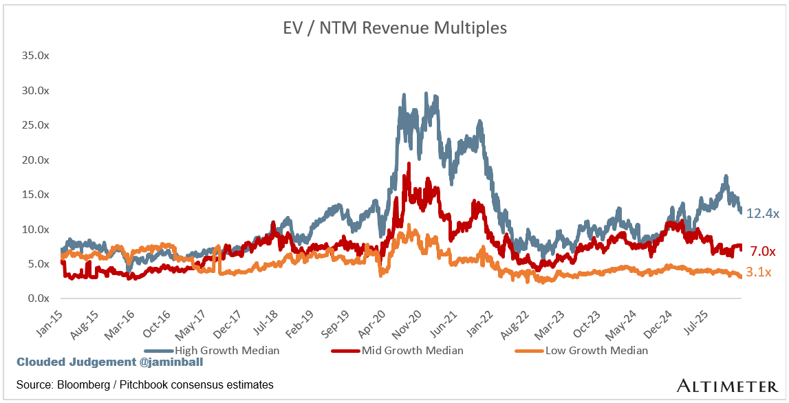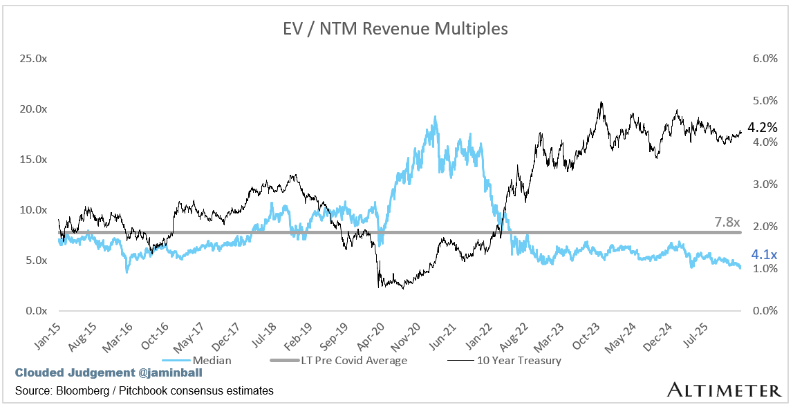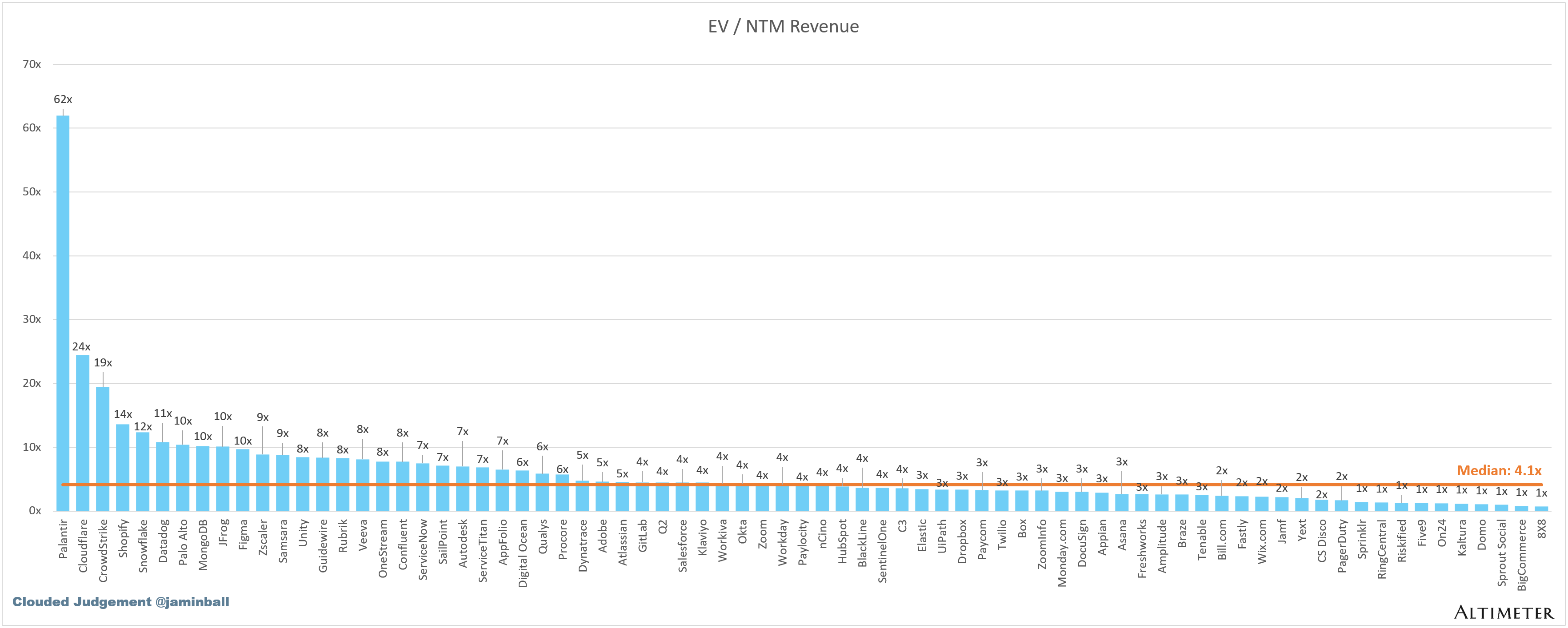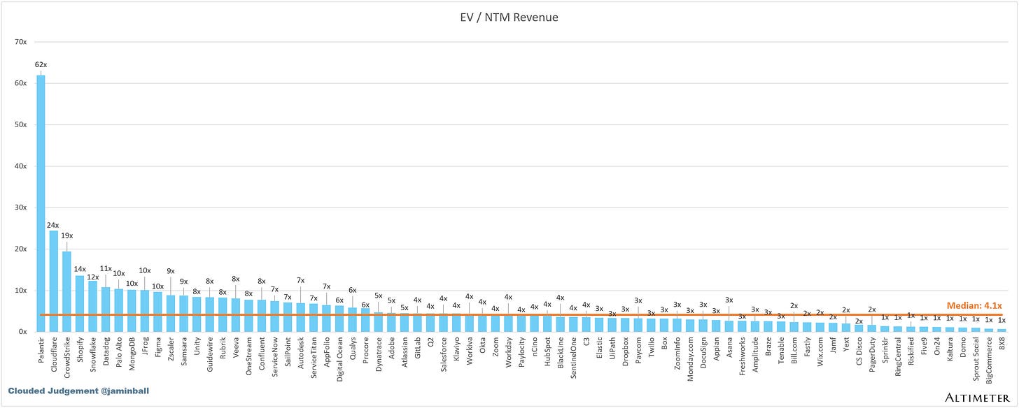 Well, software is dead again! At least investor confidence is dead… The median NTM revenue multiple for the cloud software universe is 4.1x. That’s the lowest it’s been in 10 years (it was about the same very briefly in 2016, when the fed started hiking rates for the first time after the GFC ZIRP period).