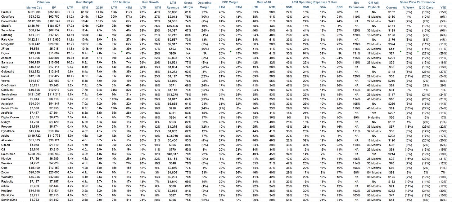 Rule of 40 shows rev growth + FCF margin (both LTM and NTM for growth + margins). FCF calculated as Cash Flow from Operations - Capital Expenditures