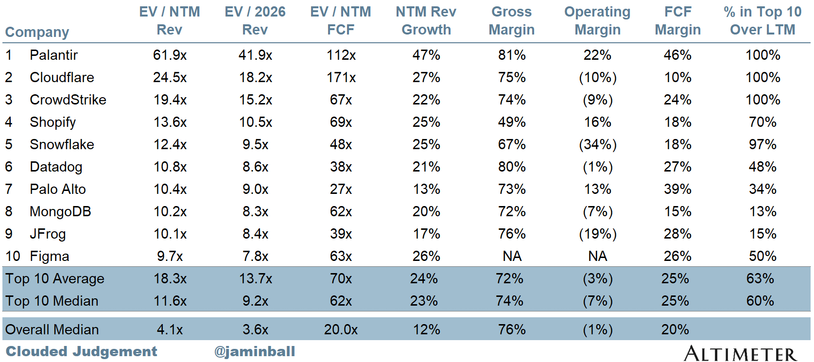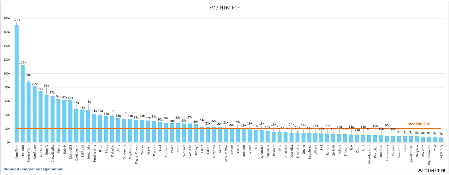 SaaS businesses are generally valued on a multiple of their revenue - in most cases the projected revenue for the next 12 months. Revenue multiples are a shorthand valuation framework. Given most software companies are not profitable, or not generating meaningful FCF, it’s the only metric to compare the entire industry against. Even a DCF is riddled with long term assumptions. The promise of SaaS is that growth in the early years leads to profits in the mature years. Multiples shown below are calculated by taking the Enterprise Value (market cap + debt - cash) / NTM revenue.