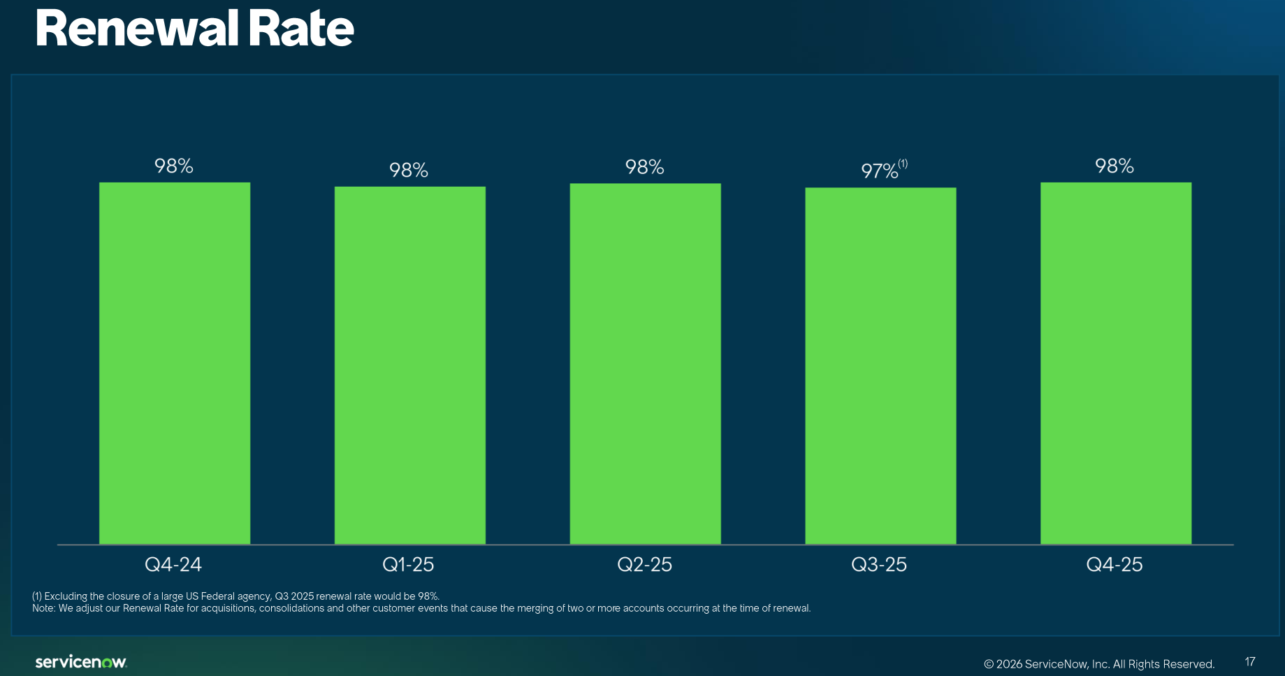 Even if you vehemently disagree with what’s happening in the market today, the real question becomes “what will change the markets mind.” In my opinion it will take a few quarters of showing “stable” retention rates in the face of AI challengers to give the market confidence back. So far we’ve only had a few companies report Q4 earnings. ServiceNow (a stalwart cloud software business) was one of them. Their retention rates haven’t taken a hit yet!