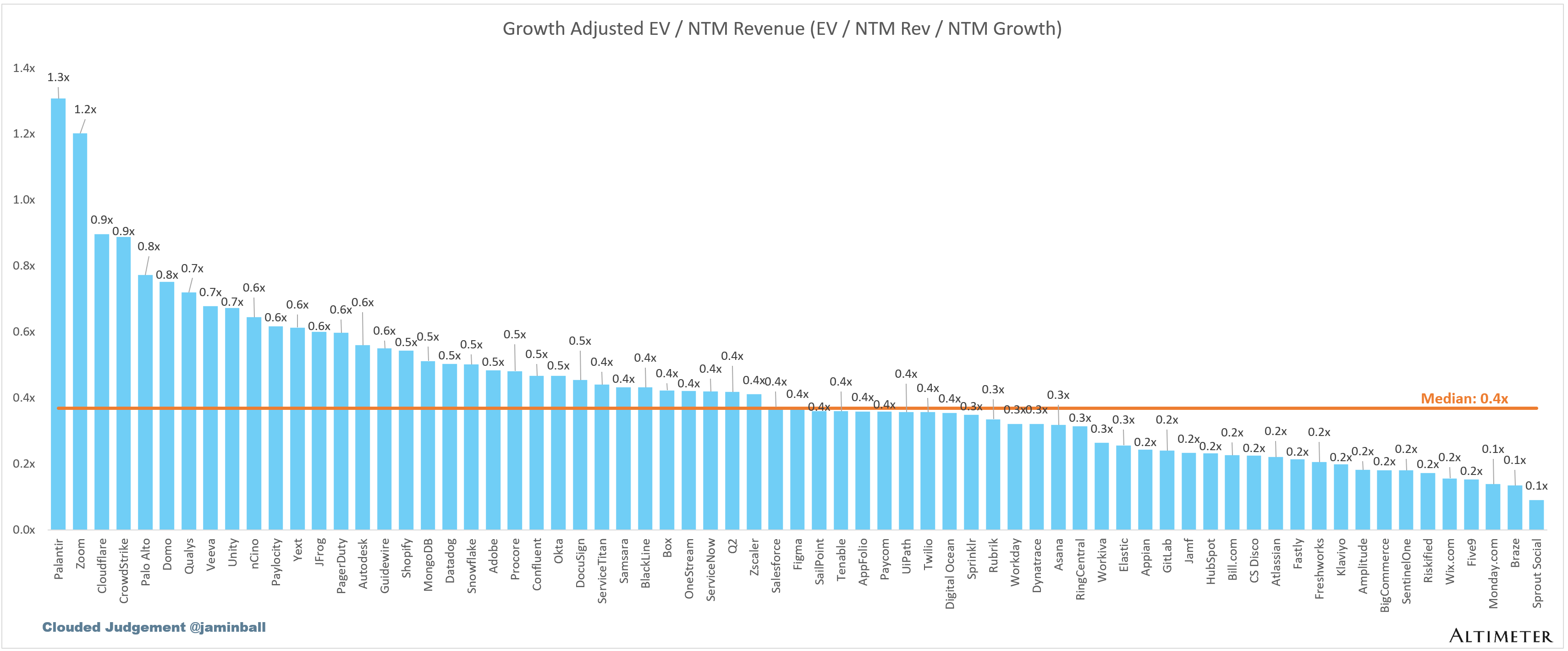 The below chart shows the EV / NTM revenue multiple divided by NTM consensus growth expectations. So a company trading at 20x NTM revenue that is projected to grow 100% would be trading at 0.2x. The goal of this graph is to show how relatively cheap / expensive each stock is relative to its growth expectations.