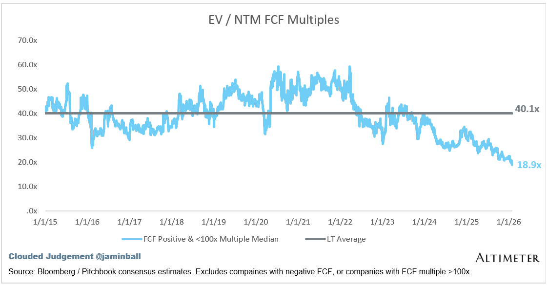 The line chart shows the median of all companies with a FCF multiple >0x and <100x. I created this subset to show companies where FCF is a relevant valuation metric.