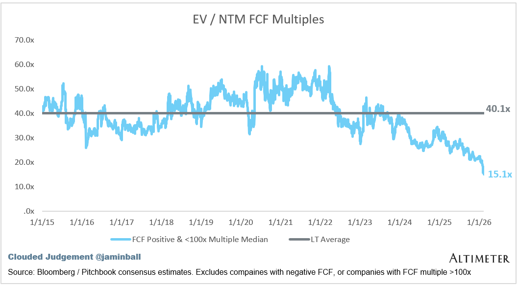 The line chart shows the median of all companies with a FCF multiple >0x and <100x. I created this subset to show companies where FCF is a relevant valuation metric.