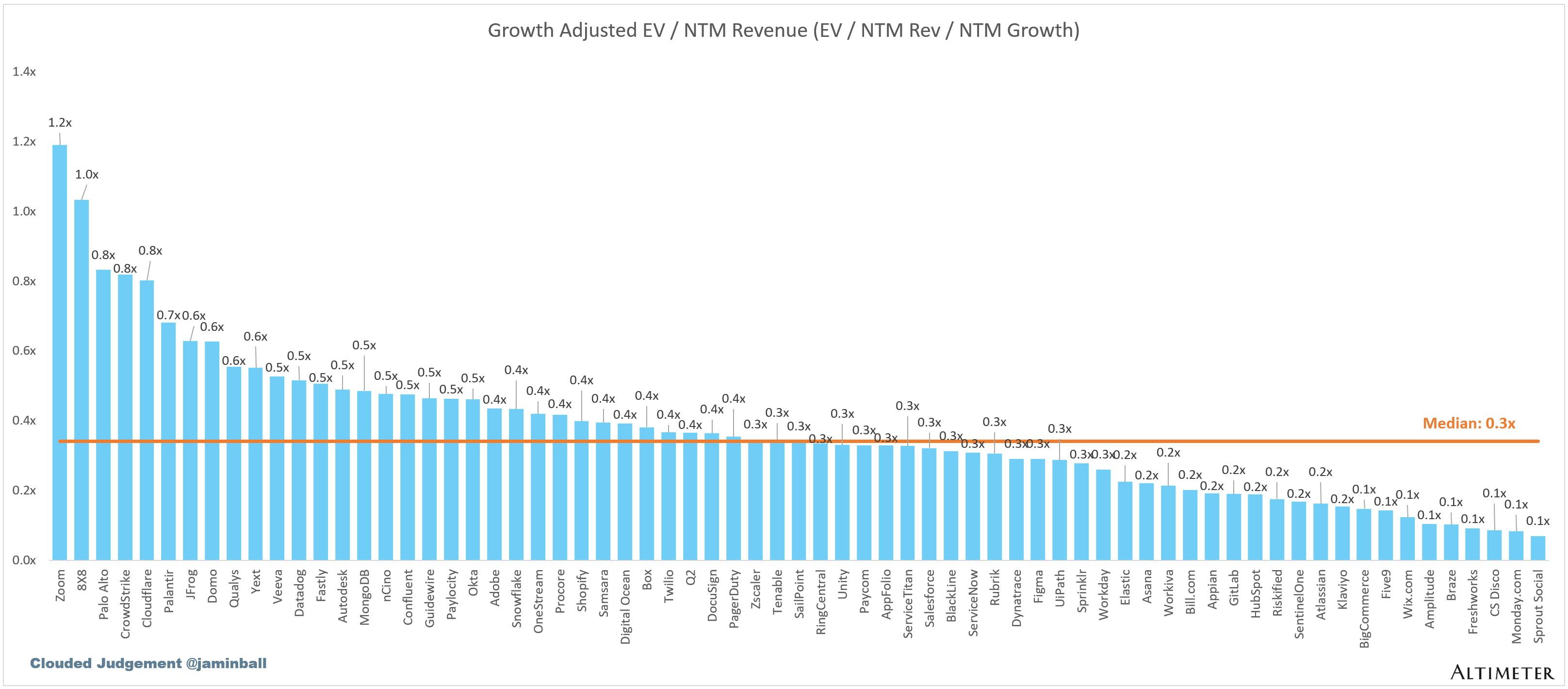The below chart shows the EV / NTM revenue multiple divided by NTM consensus growth expectations. So a company trading at 20x NTM revenue that is projected to grow 100% would be trading at 0.2x. The goal of this graph is to show how relatively cheap / expensive each stock is relative to its growth expectations.