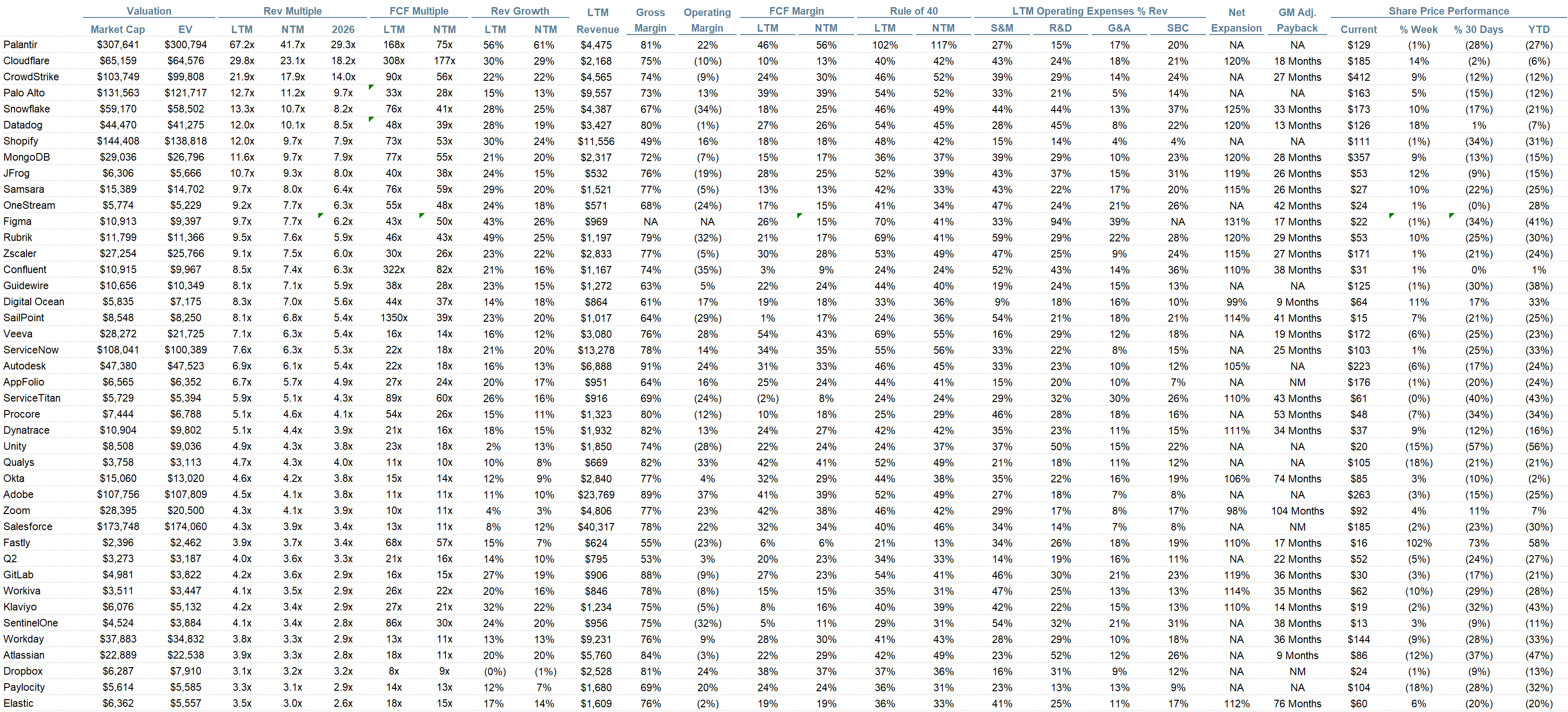 Rule of 40 shows rev growth + FCF margin (both LTM and NTM for growth + margins). FCF calculated as Cash Flow from Operations - Capital Expenditures