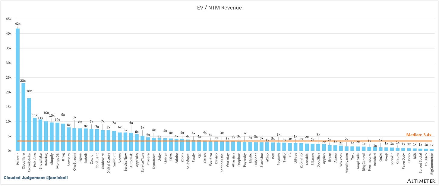 SaaS businesses are generally valued on a multiple of their revenue - in most cases the projected revenue for the next 12 months. Revenue multiples are a shorthand valuation framework. Given most software companies are not profitable, or not generating meaningful FCF, it’s the only metric to compare the entire industry against. Even a DCF is riddled with long term assumptions. The promise of SaaS is that growth in the early years leads to profits in the mature years. Multiples shown below are calculated by taking the Enterprise Value (market cap + debt - cash) / NTM revenue.