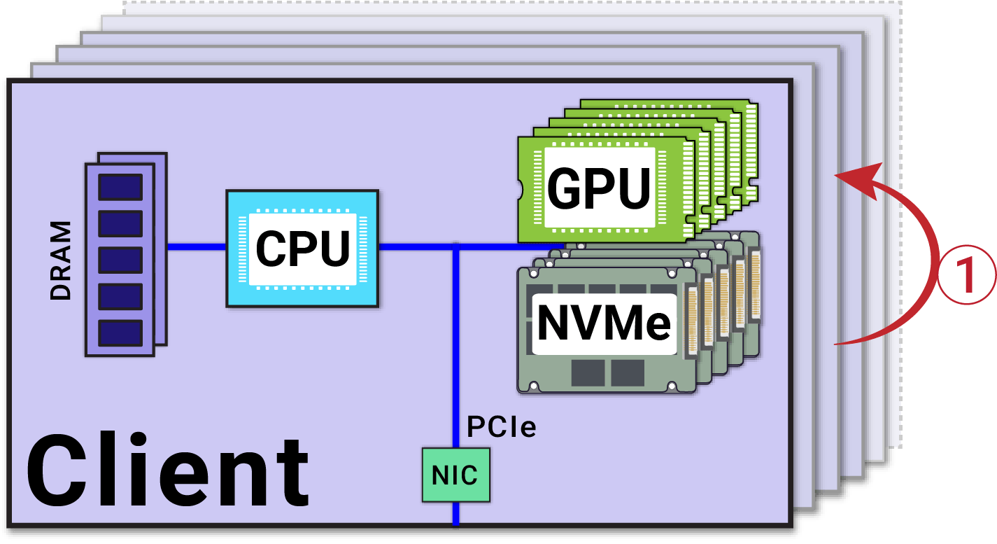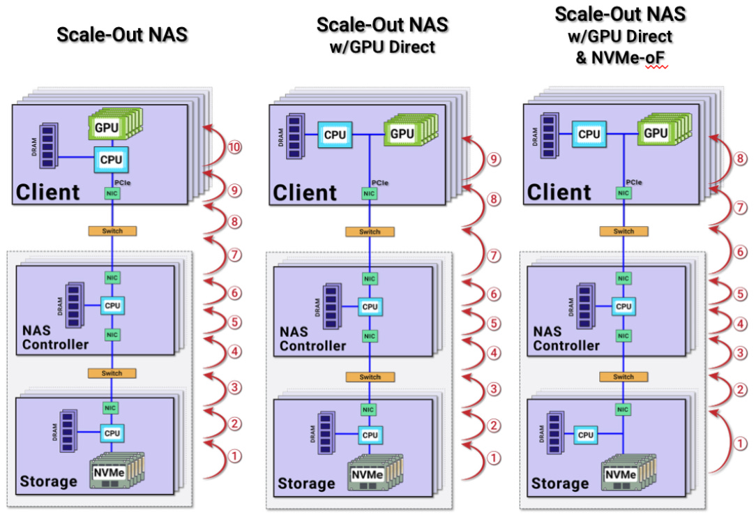 Second, the legacy NAS data path has too many hops—and too many copies. Traditional NAS architectures typically involve three roles: the storage node, a controller (or head), and the server/client. Each has CPUs, memory, NICs, and switches between them. If you trace the path from where data physically sits (let’s start at NVMe) to a GPU, the data is repeatedly staged, buffered, and copied: NVMe → CPU/memory → NIC (storage node) → switch → NIC → CPU/memory → NIC (controller) → switch → NIC → CPU/DRAM (client) → GPU (see image below). That’s easily 8–10 copies/hops depending on the design. When performance requirements were modest, this “hop tax” was tolerable. In the Age of AI—especially inference, where latency and concurrency dominate—it becomes a structural bottleneck. The common “fix” is to throw more memory at caching and buffering across the stack, which drives even more demand and cost.
