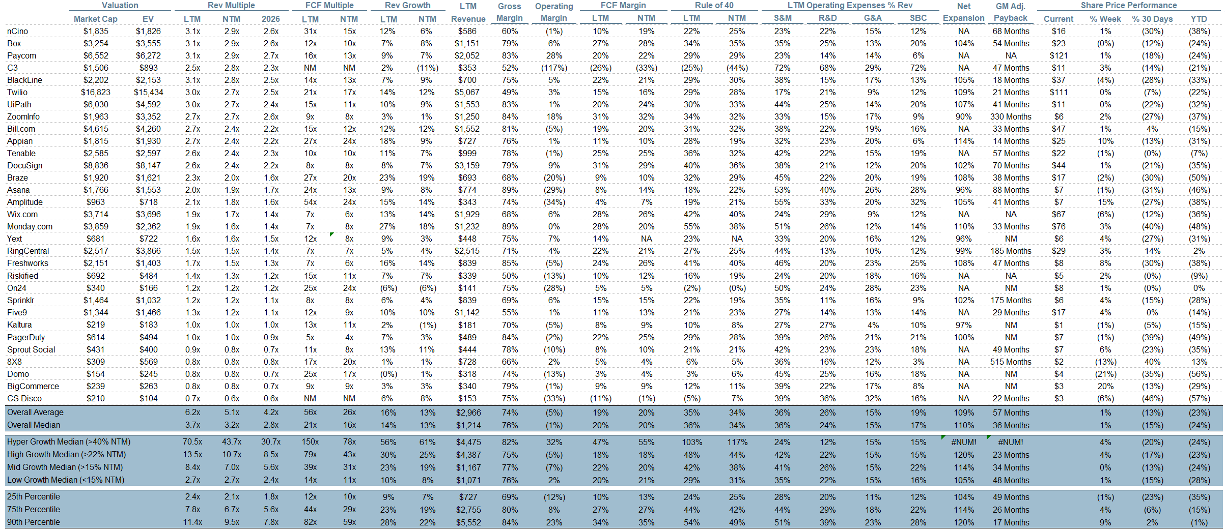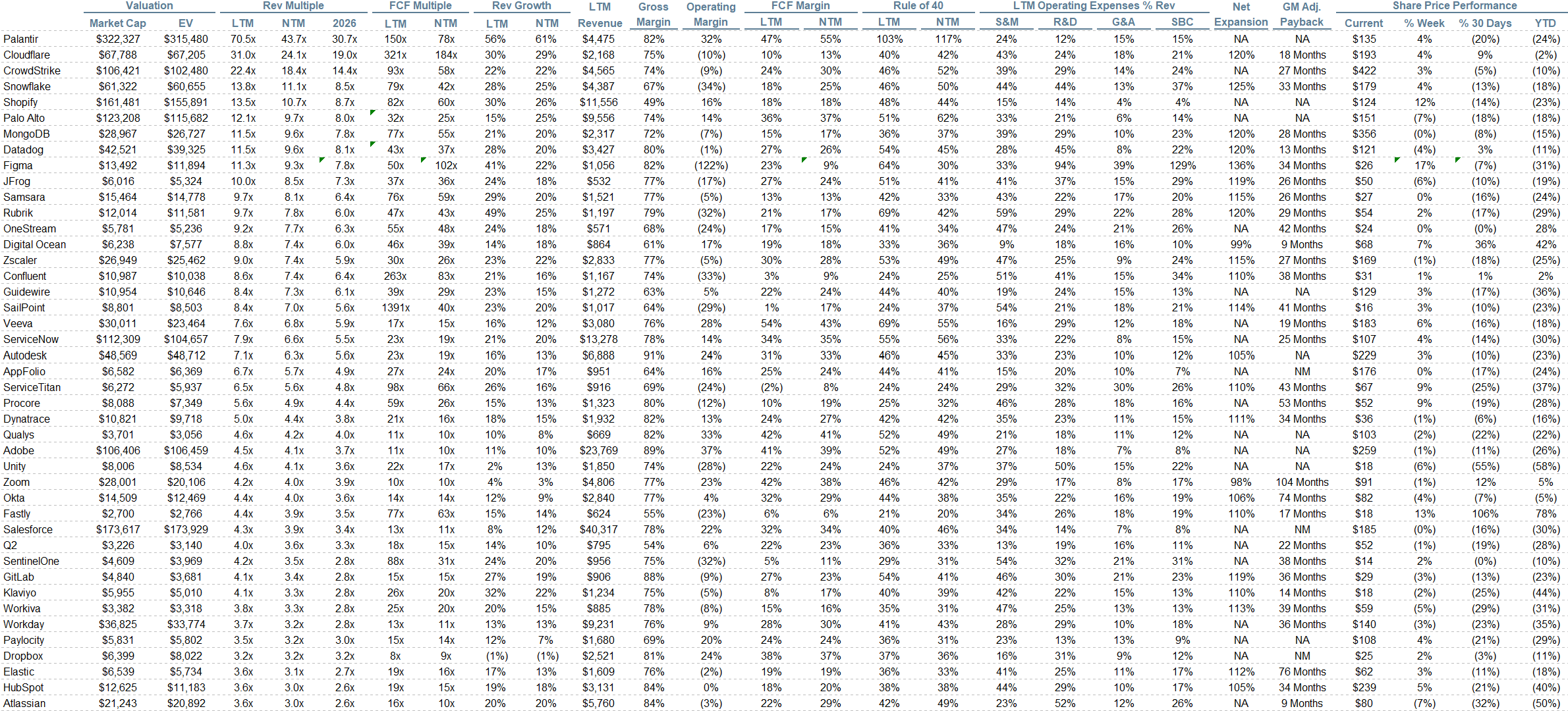 Rule of 40 shows rev growth + FCF margin (both LTM and NTM for growth + margins). FCF calculated as Cash Flow from Operations - Capital Expenditures