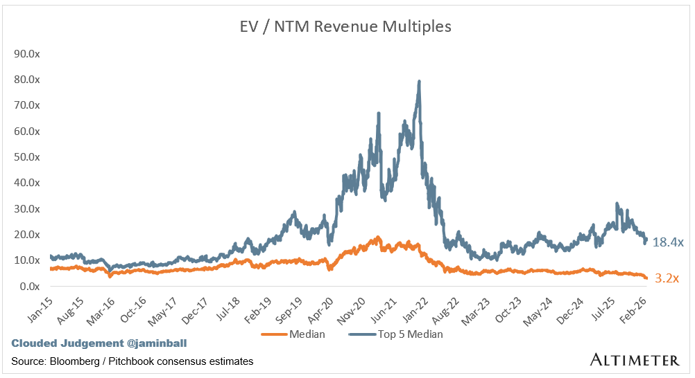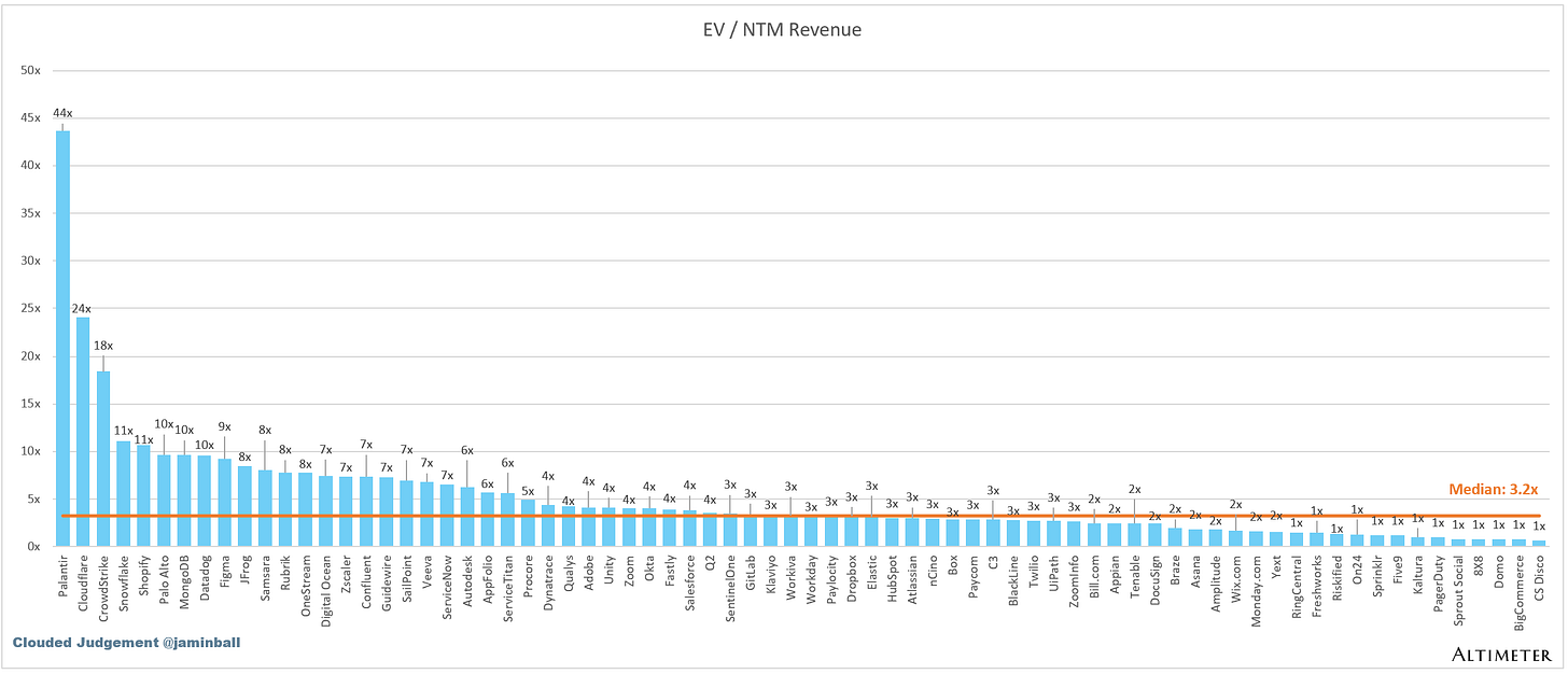 SaaS businesses are generally valued on a multiple of their revenue - in most cases the projected revenue for the next 12 months. Revenue multiples are a shorthand valuation framework. Given most software companies are not profitable, or not generating meaningful FCF, it’s the only metric to compare the entire industry against. Even a DCF is riddled with long term assumptions. The promise of SaaS is that growth in the early years leads to profits in the mature years. Multiples shown below are calculated by taking the Enterprise Value (market cap + debt - cash) / NTM revenue.