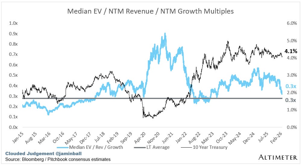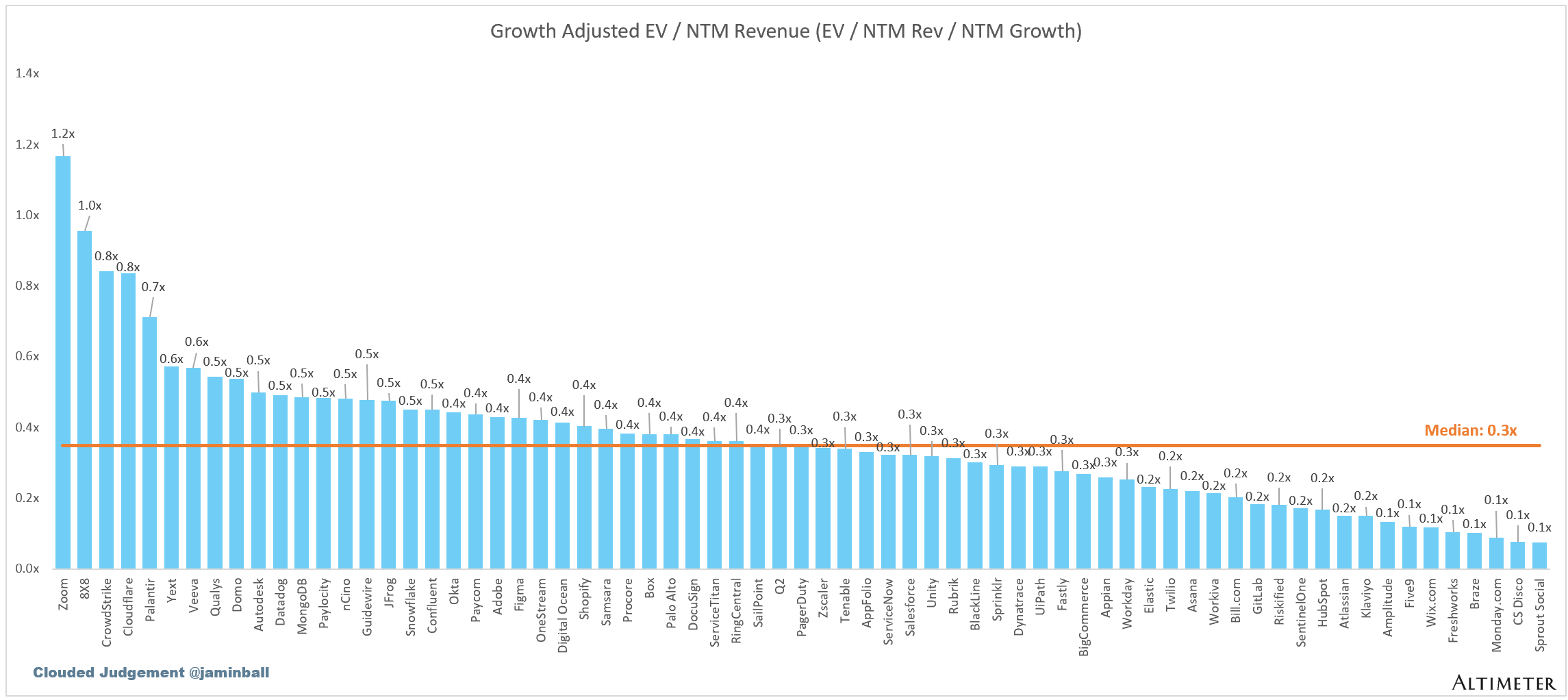 The below chart shows the EV / NTM revenue multiple divided by NTM consensus growth expectations. So a company trading at 20x NTM revenue that is projected to grow 100% would be trading at 0.2x. The goal of this graph is to show how relatively cheap / expensive each stock is relative to its growth expectations.