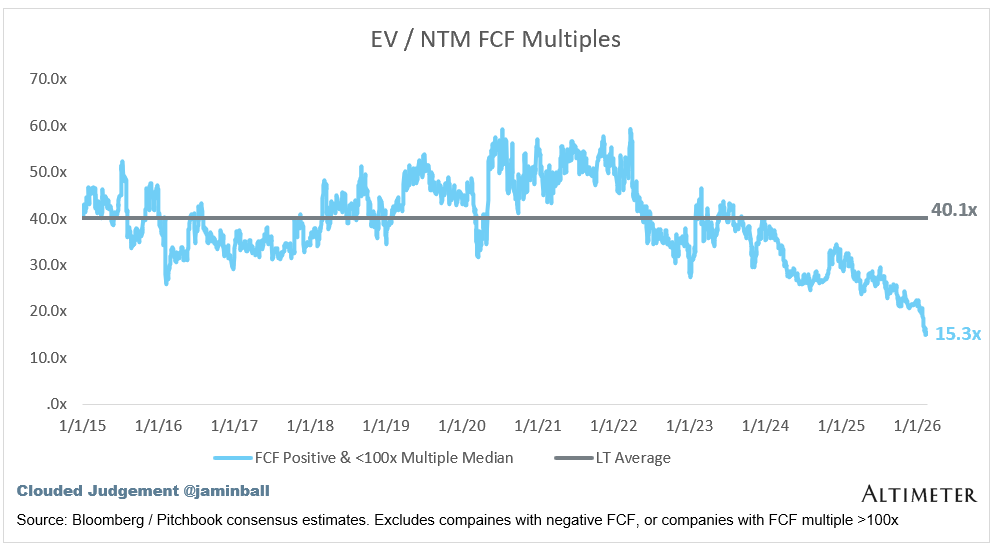 The line chart shows the median of all companies with a FCF multiple >0x and <100x. I created this subset to show companies where FCF is a relevant valuation metric.