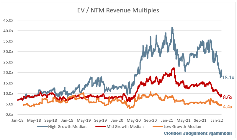 There’s an old saying - don’t fight the Fed… Through the pandemic the fed pumped >$1T into the economy and took rates to zero. Growth and risk assets skyrocketed because of this. Now - as we see the light at the end of the tunnel around Covid, and with inflation rising dramatically, the Fed pricked the asset bubble and signaled rate hikes across 2022 and QT. This caused growth and risk assets to plummet. All the while the fundamentals of cloud software have never been stronger. But it doesn’t matter, the Fed rules all :)