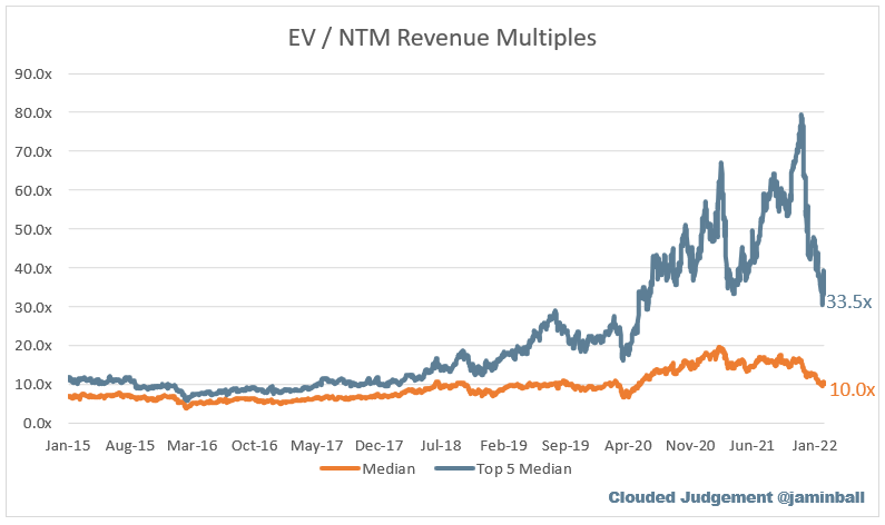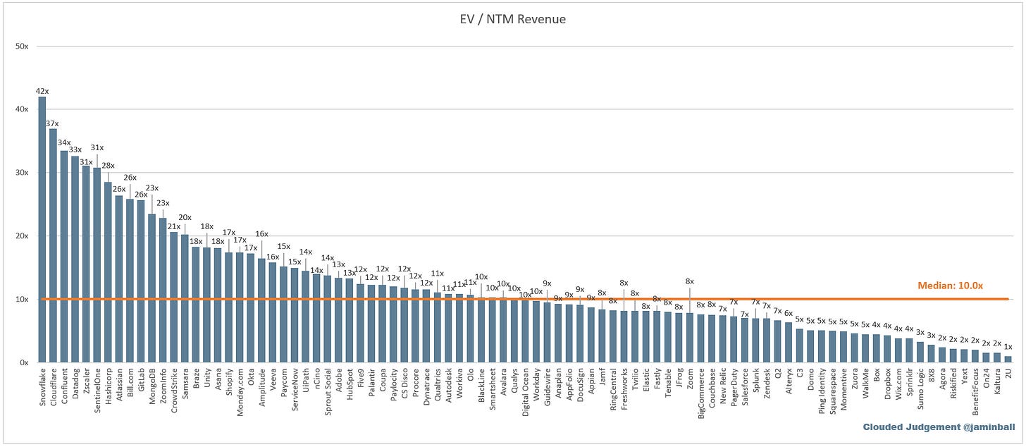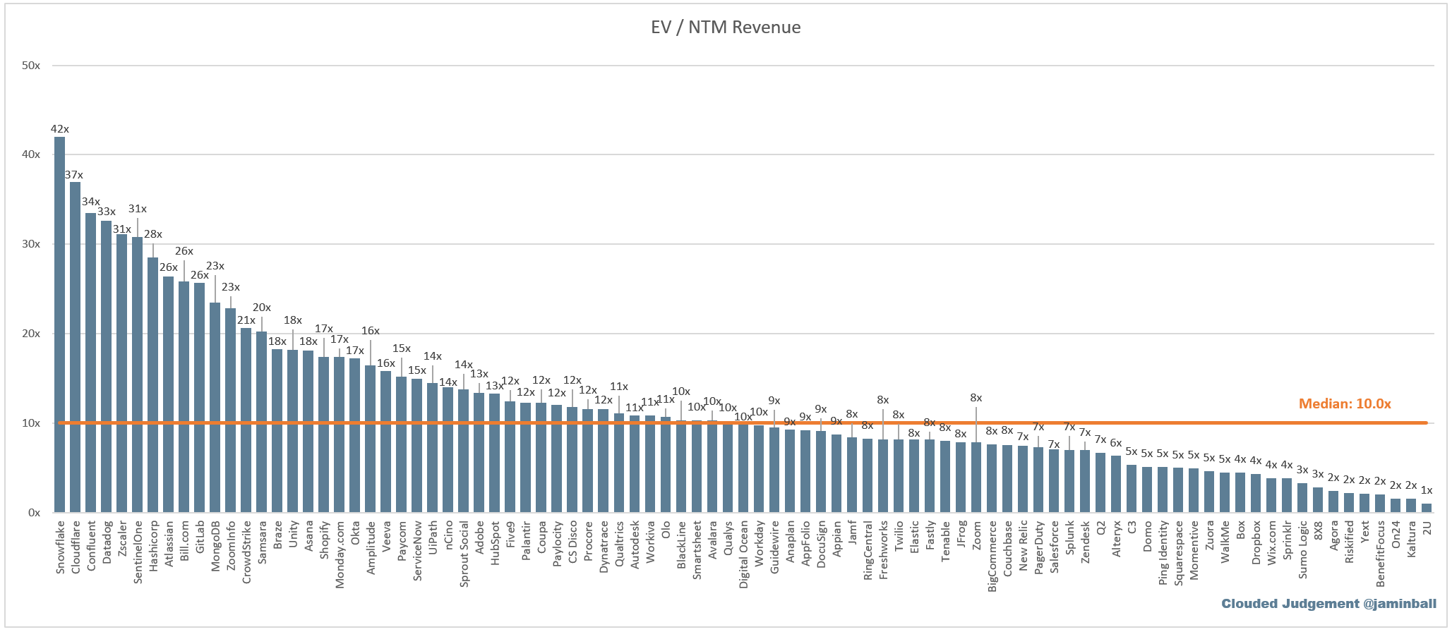 SaaS businesses are valued on a multiple of their revenue - in most cases the projected revenue for the next 12 months. Multiples shown below are calculated by taking the Enterprise Value (market cap + debt - cash) / NTM revenue.