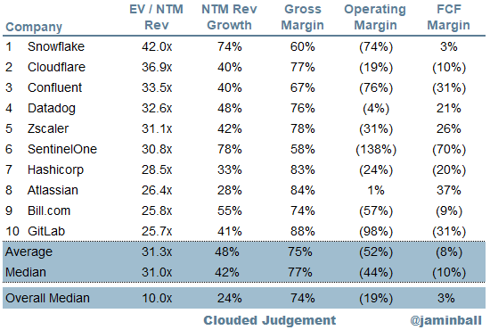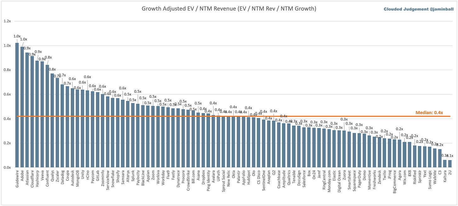 The below chart shows the EV / NTM revenue multiple divided by NTM consensus growth expectations. The goal of this graph is to show how relatively cheap / expensive each stock is relative to their growth expectations