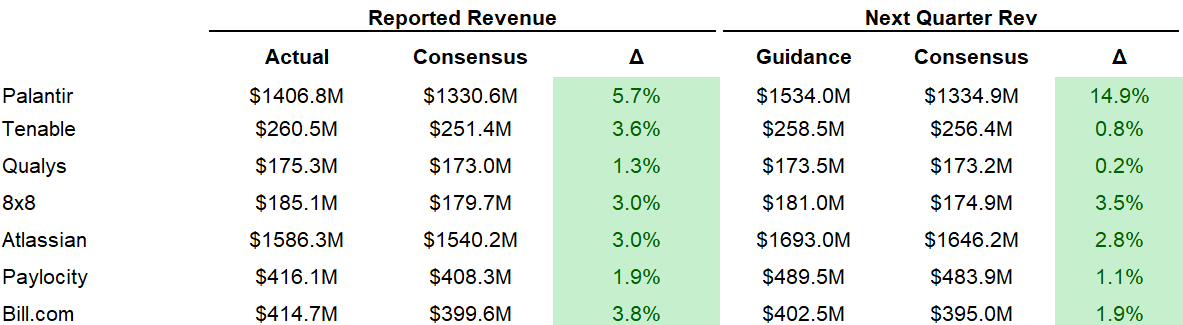 Then there’s the few software companies who have already reported earnings. ServiceNow, Atlassian, Palantir, Bill.com, Paylocity (and a few others). Results have actually been pretty solid. Median Q4 quarterly beat is 3.0%, and median guidance raise for next quarter is 2.0%. Both would be the highest mark in the last ~3 years. So far, the numbers aren’t deteriorating (but doesn’t matter, market voting machine moves quick!).