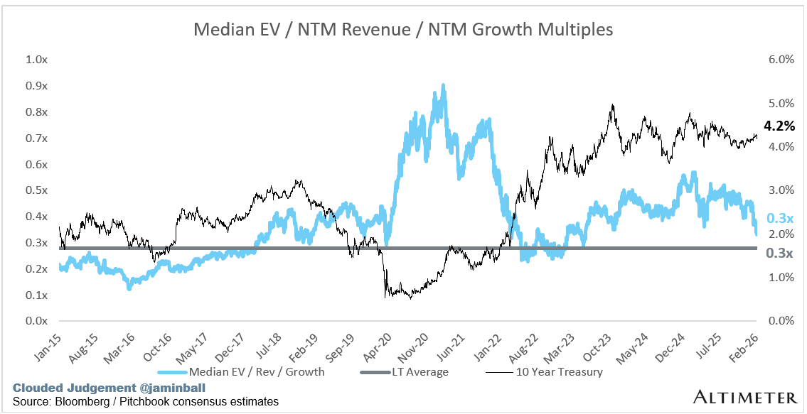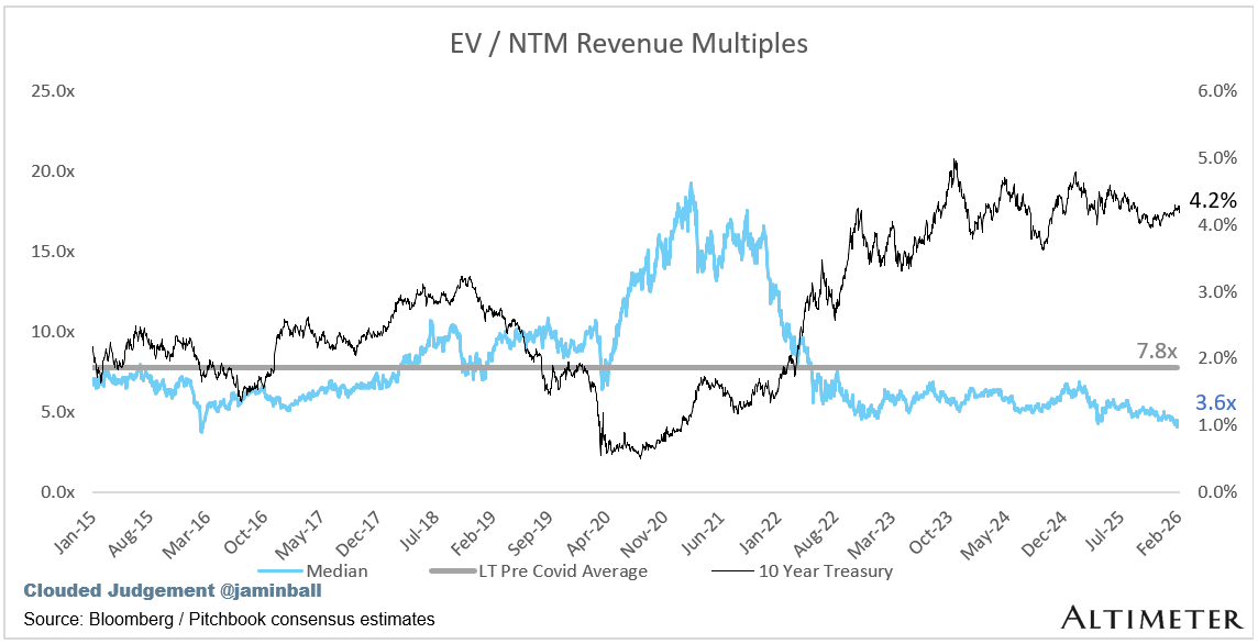 I do think growth prospects have changed. The voting machine sure believes it. I think it’s gone too far. But at the same time I think some of software universe is still over-valued. There will (could) be some epic returns from here if you pick the 10% who become more of an “AI winner” who can avoid being pushed down / reduced to middleware. Those looking at my multiple charts and saying “but the pre-covid average multiple was 8x NTM rev, we’ll bounce back eventually” will probably be disappointed. If we ever get back there (as an industry median) it will probably be because a new crop of “AI native Agent” companies in hyper growth mode go public and bring the median up. The basket of existing cloud software companies may never get back to a median of 8x NTM rev (mark that statement in case we do, and this is the bottom!)