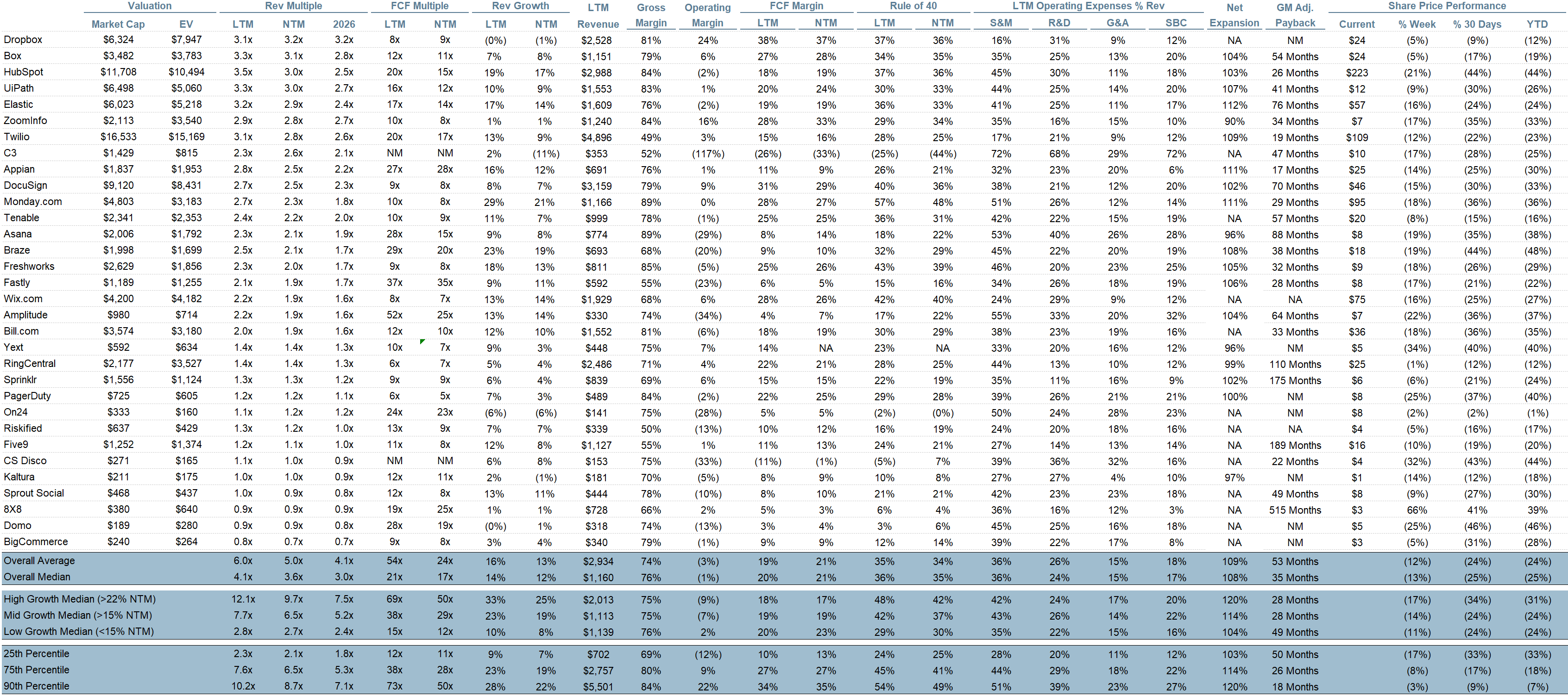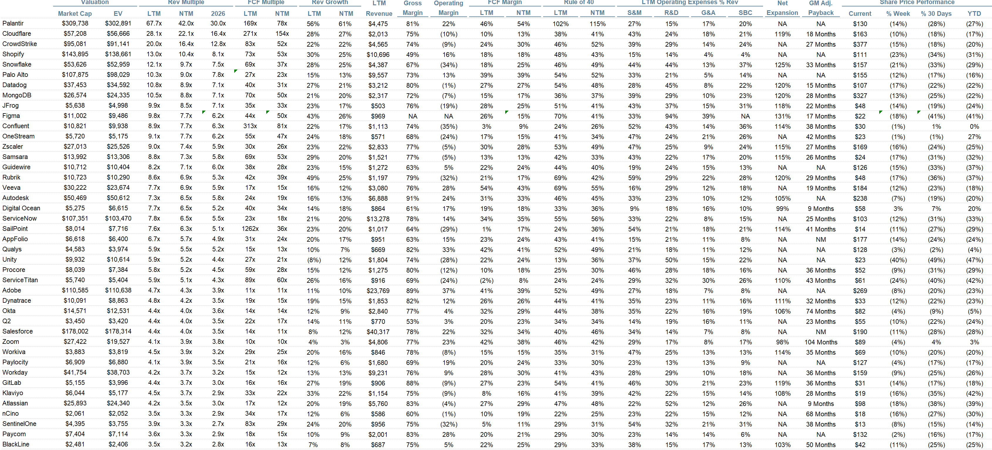 Rule of 40 shows rev growth + FCF margin (both LTM and NTM for growth + margins). FCF calculated as Cash Flow from Operations - Capital Expenditures