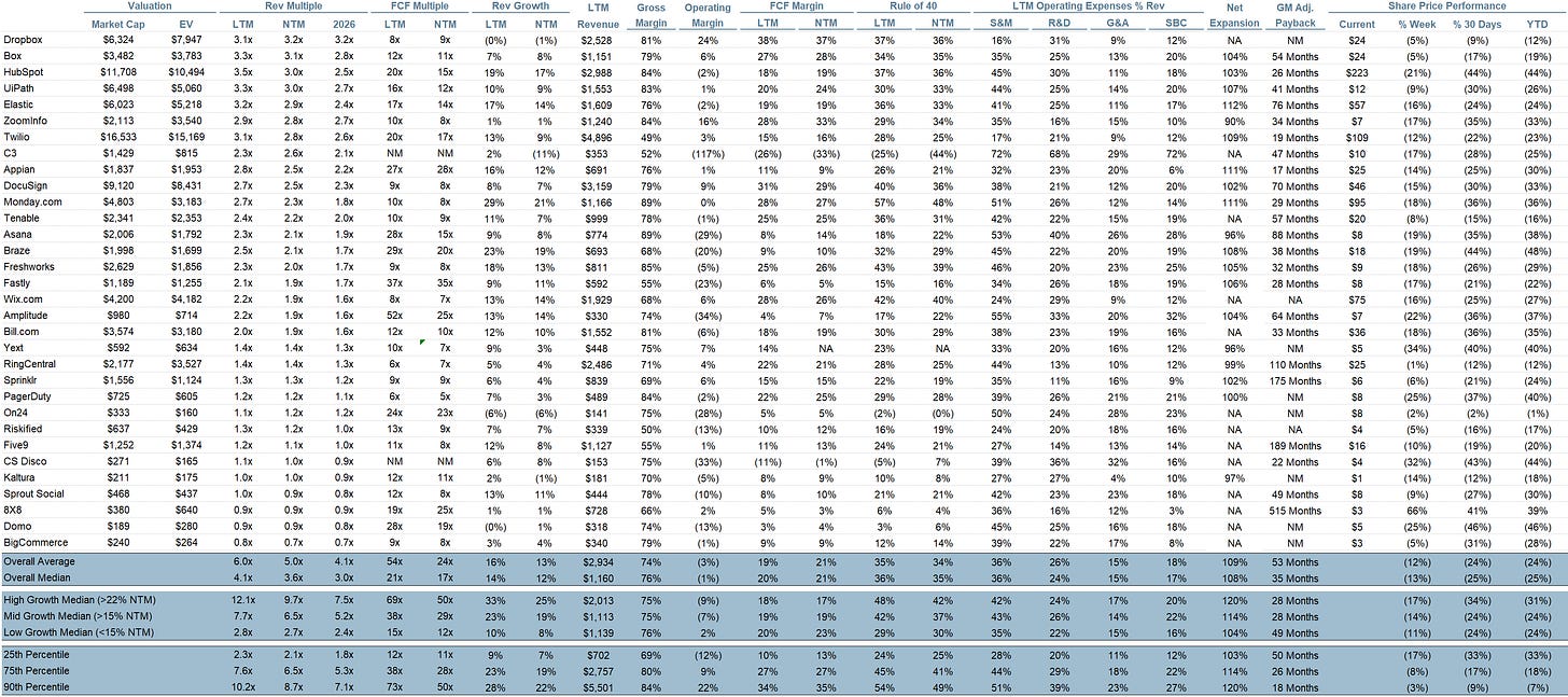 SaaS businesses are generally valued on a multiple of their revenue - in most cases the projected revenue for the next 12 months. Revenue multiples are a shorthand valuation framework. Given most software companies are not profitable, or not generating meaningful FCF, it’s the only metric to compare the entire industry against. Even a DCF is riddled with long term assumptions. The promise of SaaS is that growth in the early years leads to profits in the mature years. Multiples shown below are calculated by taking the Enterprise Value (market cap + debt - cash) / NTM revenue.
