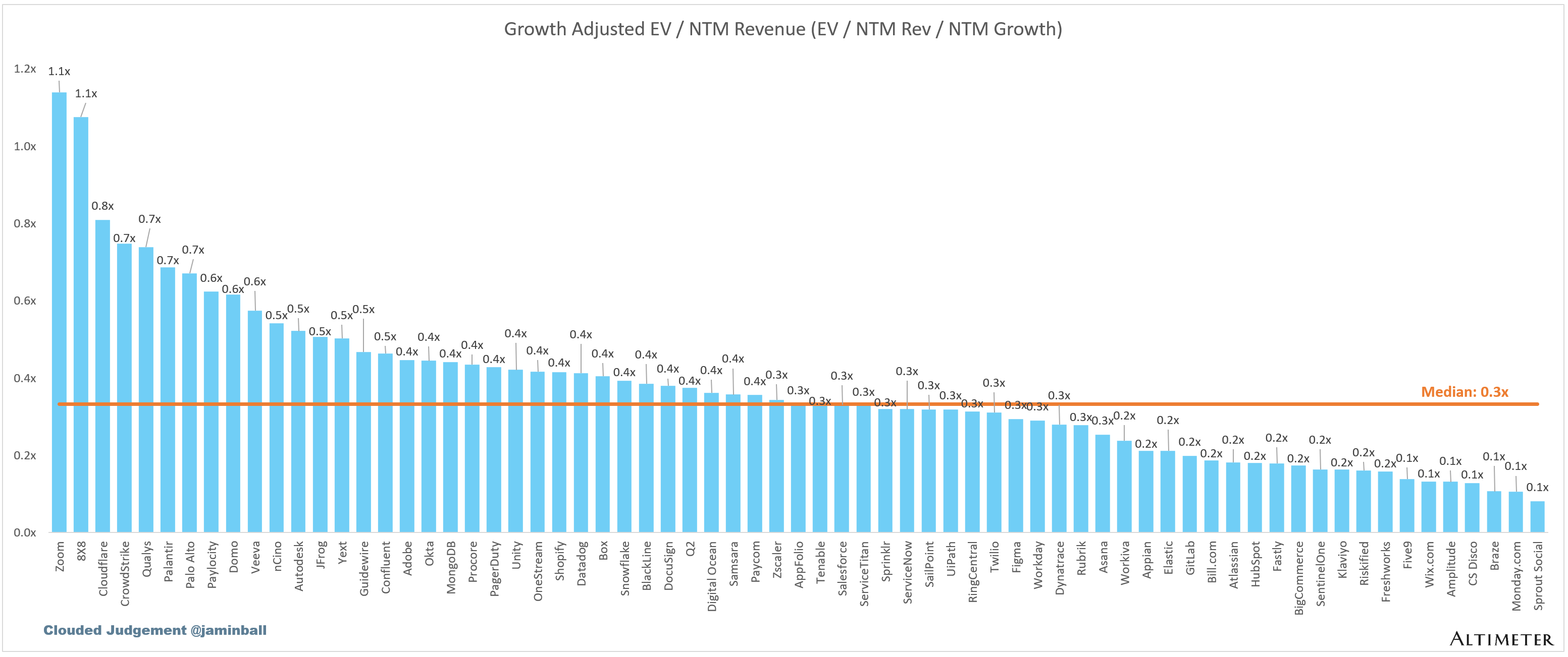 The below chart shows the EV / NTM revenue multiple divided by NTM consensus growth expectations. So a company trading at 20x NTM revenue that is projected to grow 100% would be trading at 0.2x. The goal of this graph is to show how relatively cheap / expensive each stock is relative to its growth expectations.