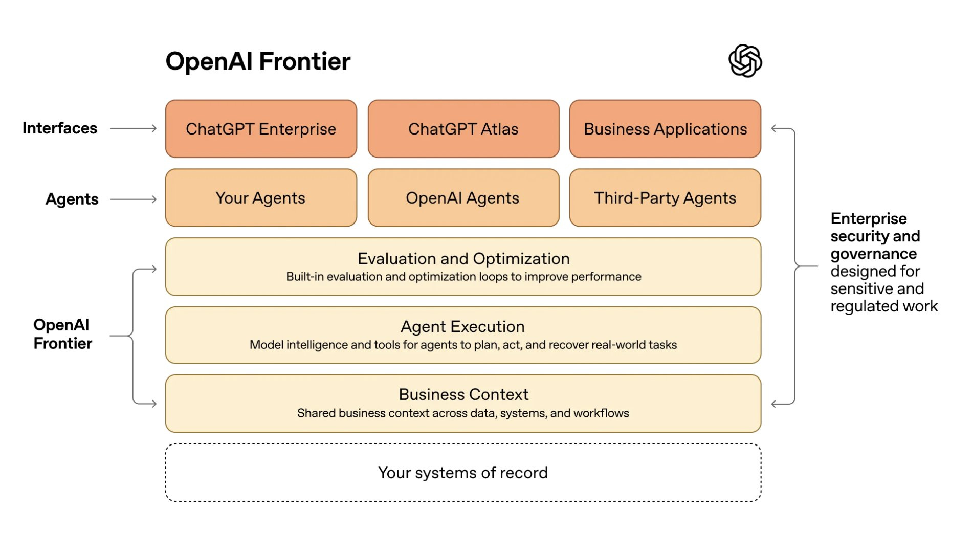 What I do believe - there’s real “front door” risk. I wrote about it here in December. In summary, classic software could be reduced to something that looks more like middleware with agents capturing all of the incremental value on top of them. I mean, look at this graphic from OpenAI…It’s screaming “the classic system of records will be pushed down the stack.” The system of record is literally at the bottom…Down the stack = lower growth potential, and smaller profit pool to capture.
