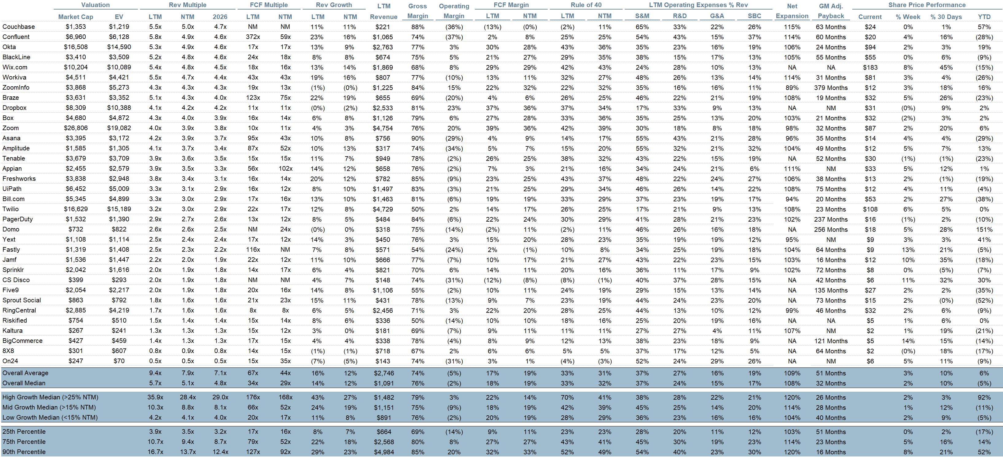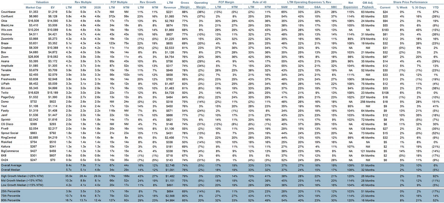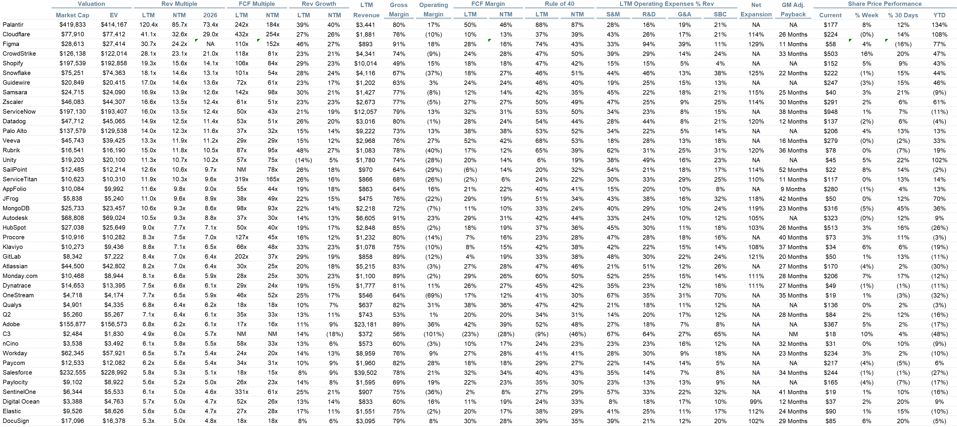 Rule of 40 shows rev growth + FCF margin (both LTM and NTM for growth + margins). FCF calculated as Cash Flow from Operations - Capital Expenditures