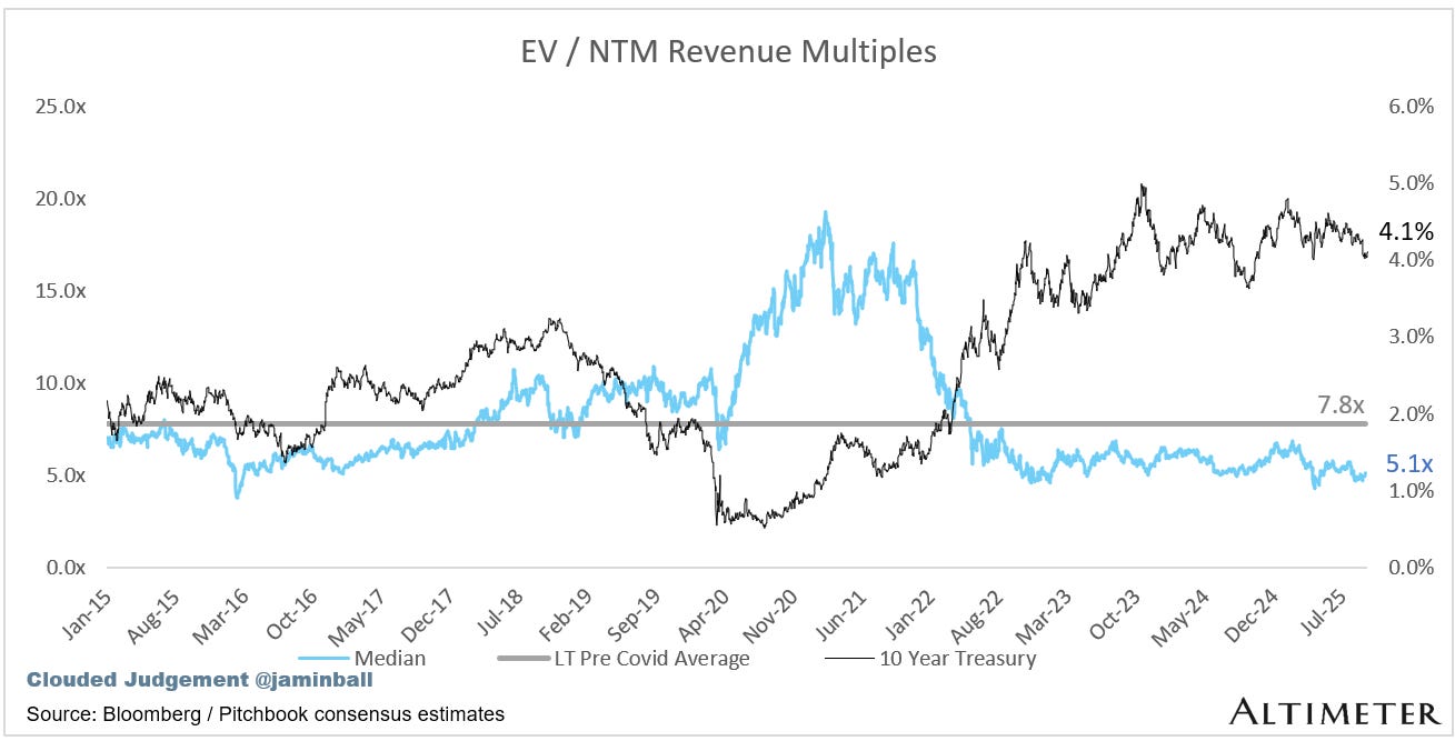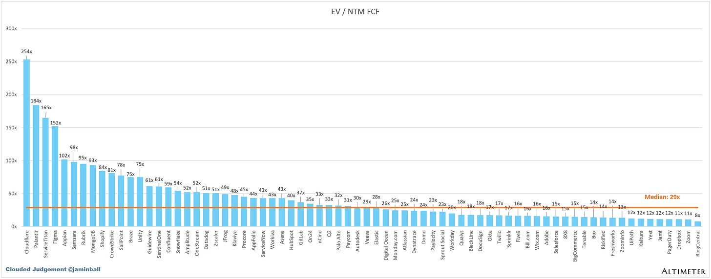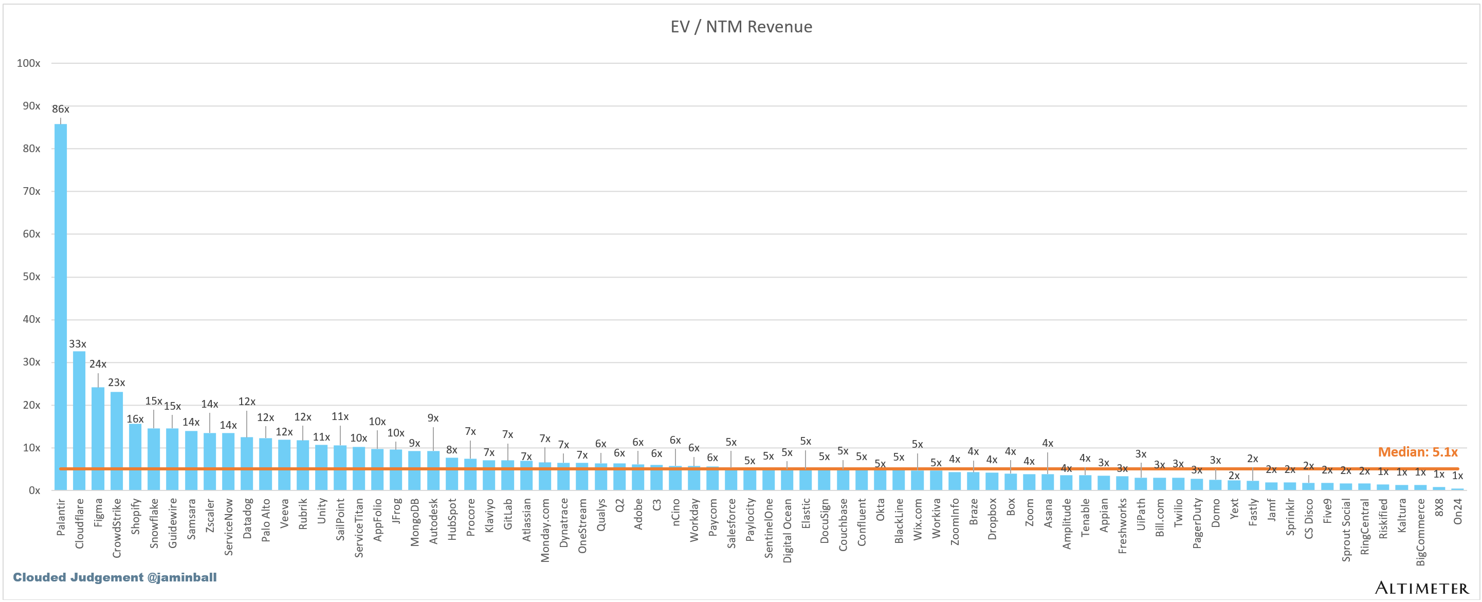 SaaS businesses are generally valued on a multiple of their revenue - in most cases the projected revenue for the next 12 months. Revenue multiples are a shorthand valuation framework. Given most software companies are not profitable, or not generating meaningful FCF, it’s the only metric to compare the entire industry against. Even a DCF is riddled with long term assumptions. The promise of SaaS is that growth in the early years leads to profits in the mature years. Multiples shown below are calculated by taking the Enterprise Value (market cap + debt - cash) / NTM revenue.