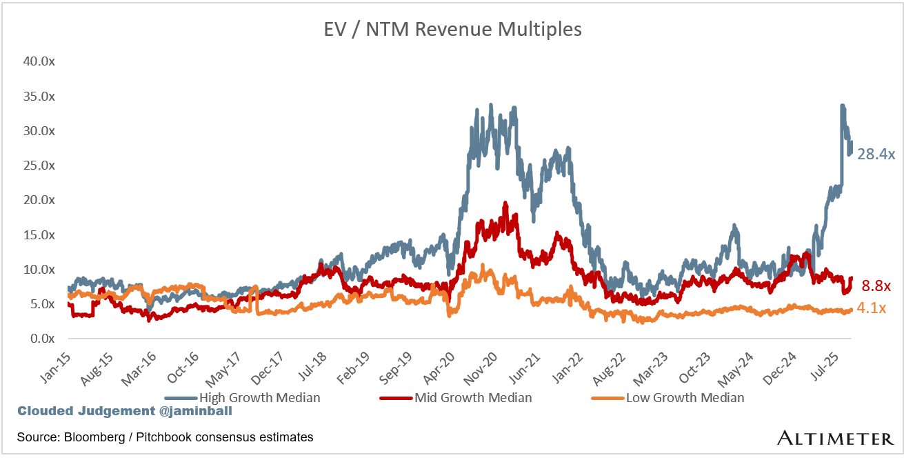 Bucketed by Growth. In the buckets below I consider high growth >25% projected NTM growth, mid growth 15%-25% and low growth <15%