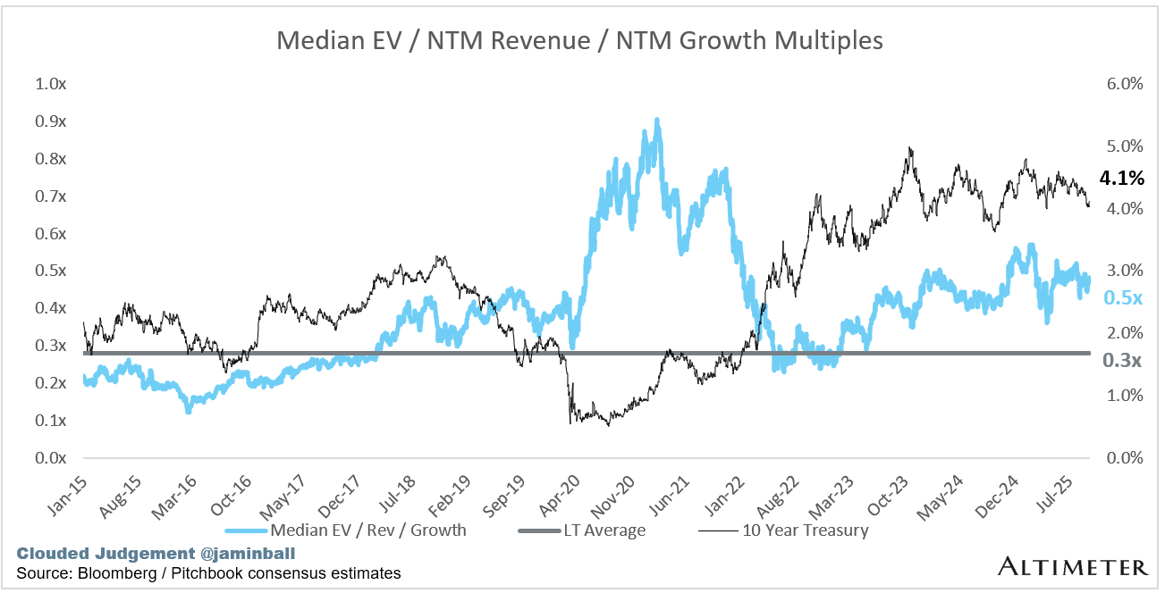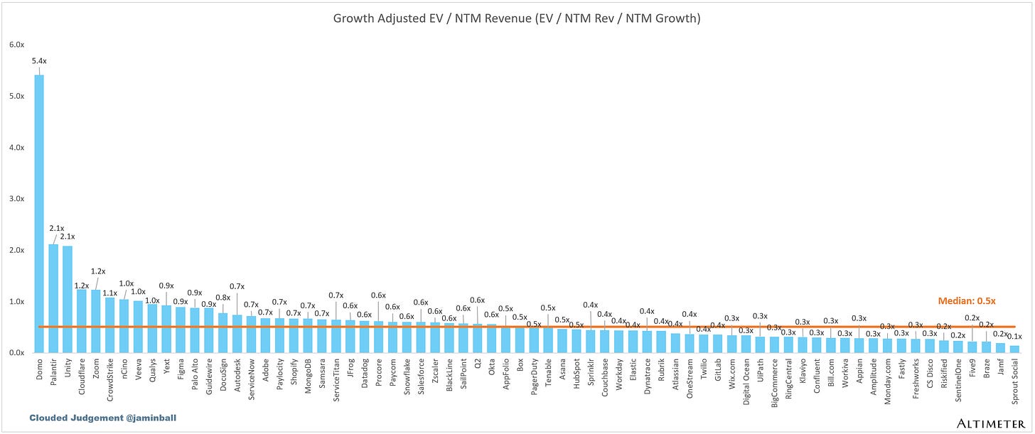 The below chart shows the EV / NTM revenue multiple divided by NTM consensus growth expectations. So a company trading at 20x NTM revenue that is projected to grow 100% would be trading at 0.2x. The goal of this graph is to show how relatively cheap / expensive each stock is relative to its growth expectations.