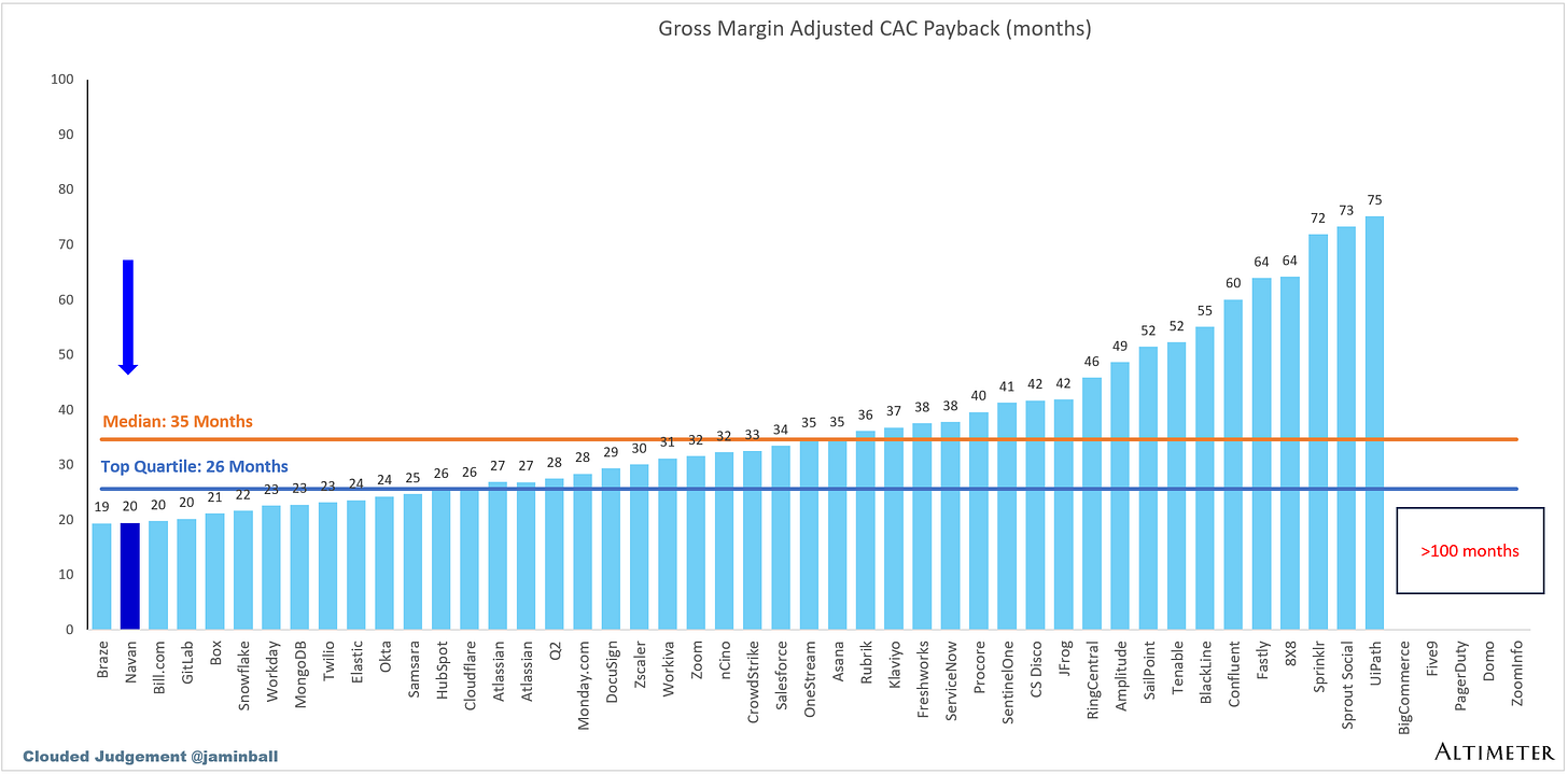 (Previous Q S&M) / (Net New ARR x Gross Margin) x 12. This metric demonstrates how long it takes (in months) for a customer to pay back the cost at which it took to acquire them. For Navan I’m just using quarterly rev x 4 to estimate ARR. It’s not perfect at all, especially with Navan’s revenue stream which is more usage / transactional based.